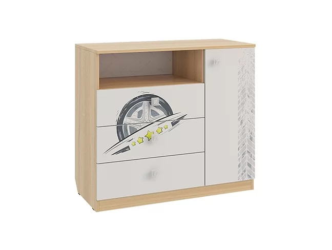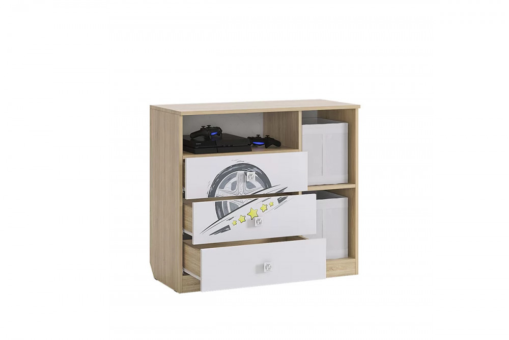 3 выкатных ящика, ниша и закрытые полки, все что нужно что бы разместить вещи вашего ребенка.  Эффектный принтерный рисунок на фасадах выдержан в общем стилистическом решении. Рисунок устойчив к истиранию и ультрафиолету. Открытая ниша для гаджетов, столешница толщиной 16мм, на которой с легкостью поместиться большой телевизор.