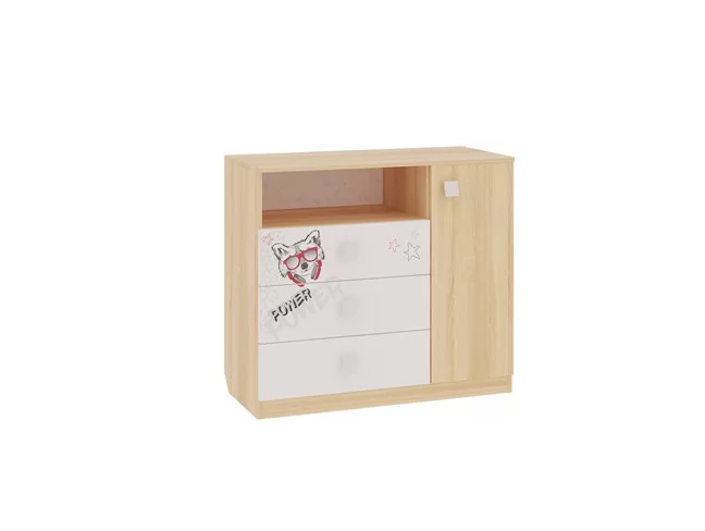 3 выкатных ящика, ниша и закрытые полки, все что нужно что бы разместить вещи вашего ребенка.  Эффектный принтерный рисунок на фасадах выдержан в общем стилистическом решении. Рисунок устойчив к истиранию и ультрафиолету. Открытая ниша для гаджетов, столешница толщиной 25мм, на которой с легкостью поместиться большой телевизор.
