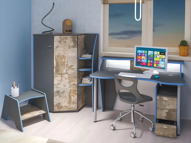 Для тех, кто ценит индивидуальность и не боится быть уникальным - предлагается молодёжная модульная система Индиго. Здесь нестандартно всё: геометрические формы, стиль, декоры. Такая мебель может стать акцентом в любом интерьере. Компьютерный стол имеет поддержку для локтей, светодиодную подсветку и подготовлен для укладки проводов компьютера (в столешнице предусмотрены заглушки). Кровать имеет вместительную выкатную систему хранения, светодиодную подсветку, функциональные приспинные полки. Часть деталей выполнена из ЛДСП толщиной 22 мм в ПВХ кромке толщиной 2 мм. Это надёжно и эстетично!