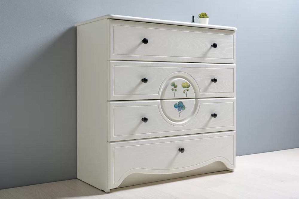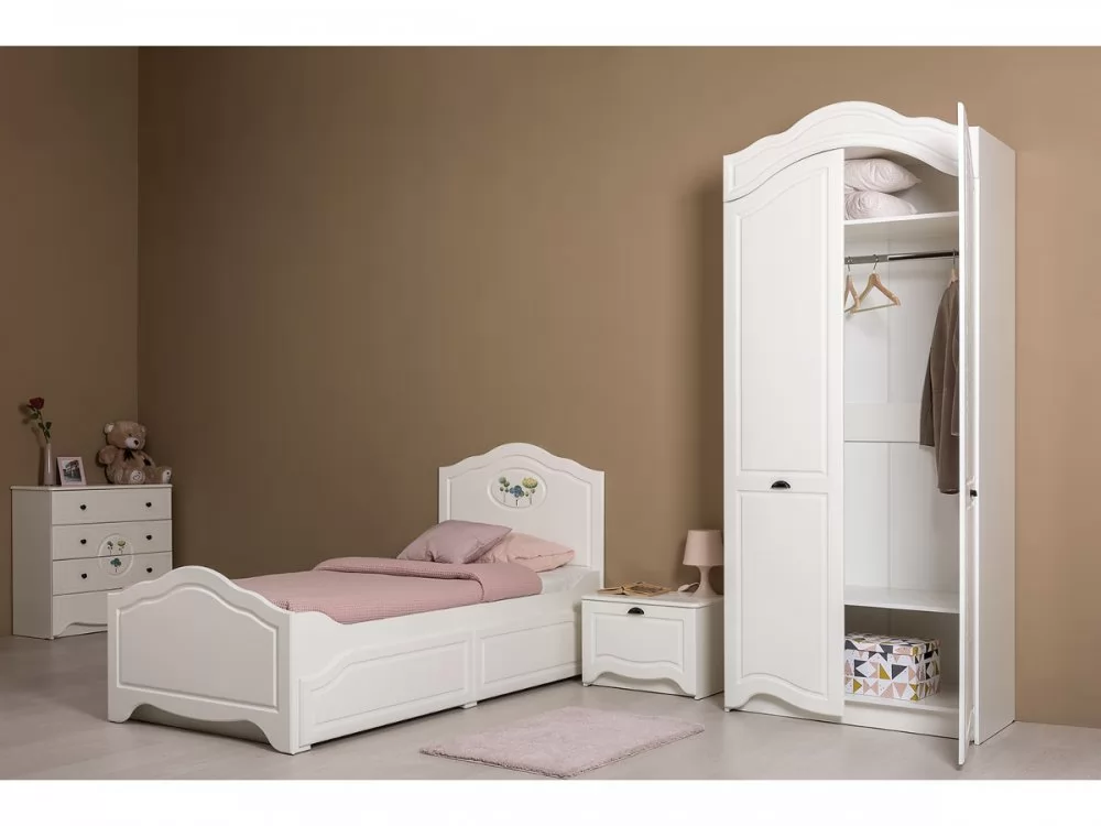 В коллекции Роуз 4 элемента с разным функционалом, которые помогут грамотно сформировать пространство детской комнаты: кровать с большим спальным местом и емкими выкатными ящиками будет шикарно смотреться при любой постановке в интерьере; вместительный комод сможет идеально распределить вещи и игрушки; просторный шкаф сохранит в порядке детский гардероб, а лаконичная, но немаловажная тумбочка отлично дополнит.