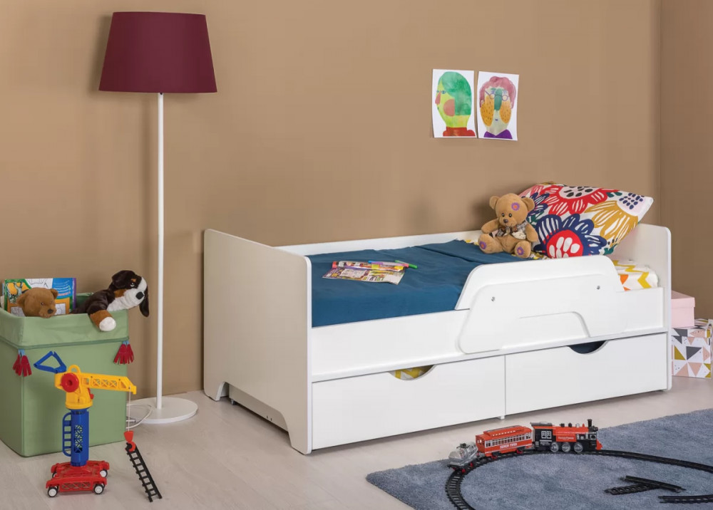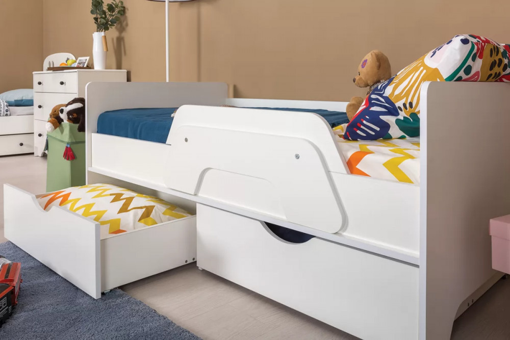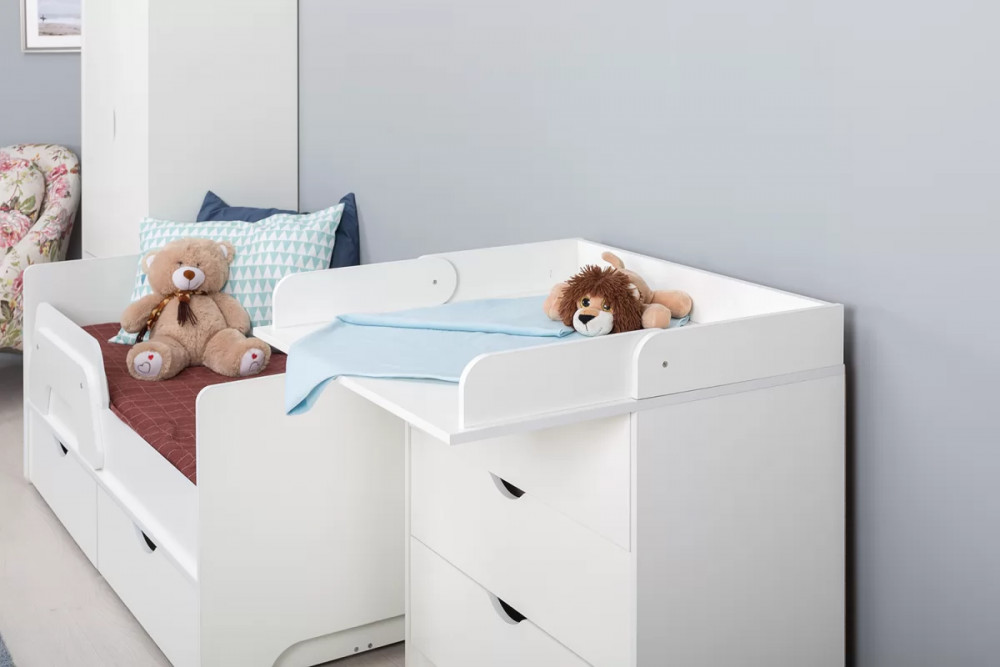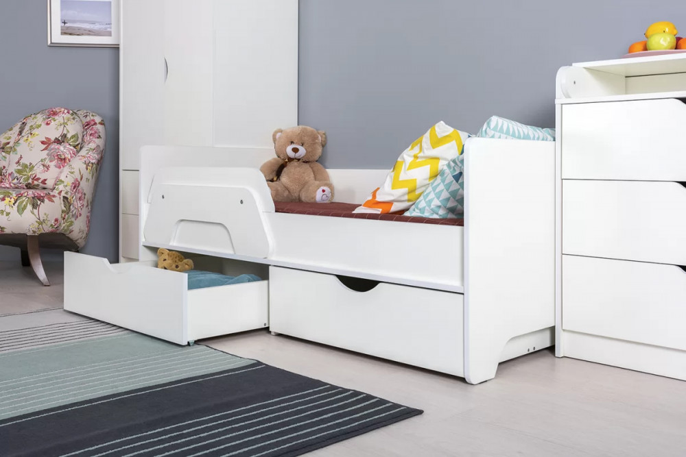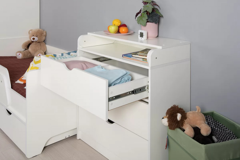 Ваш подрастающий малыш несомненно оценит изящный дизайн кроватки, а удобный съемный бортик придаст уверенность ответственным родителям в безопасности детского сна. Все элементы кровати предусмотрительно избавлены от острых углов и оформлены более толстой кромкой. Выкатные ящики - это вместительная система хранения для вещей и игрушек вашего ребенка. Удобный шкаф для одежды дополнен двумя выдвижными ящиками, что значительно увеличивает функциональность изделия. Комод оснащён складным пеленальным столиком. На всех изделиях ручками служат вырезы в фасадах, все выдвижные ящики имеют внутренние перегородки для лучшей организации хранения.
