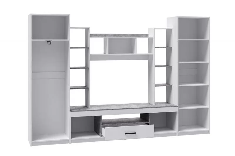 Внутреннее наполнение: один из двухстворчатых шкафов с выдвижной штангой, второй - с полками. Шкафы можно менять местами. Фурнитура: направляющие роликовые, опоры - подпятник пластиковый, черный. Ручки пластиковые, черные.