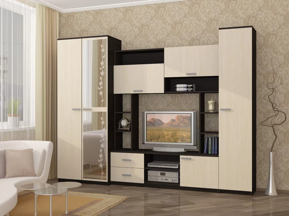 Гостиная «Флора» невероятно вместительный вариант. В ней вы сможете расположить телевизор, всю необходимую аудиотехнику, а верхние и нижние ящики прекрасно подойдут для документов и личных вещей. Кроме того, модель гостиной Флора имеет два полноценных шкафа, один из которых двустворчатый и оснащен штангой для вешалок с вашей одеждой.