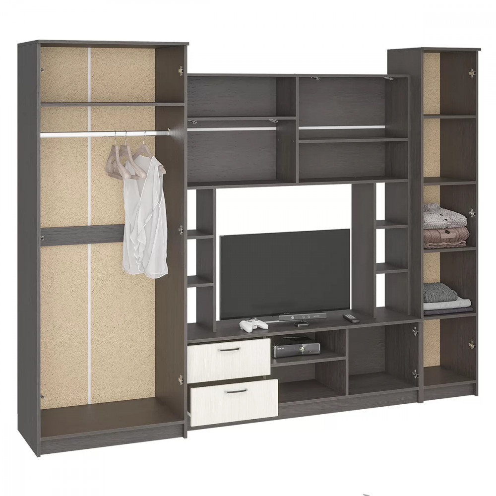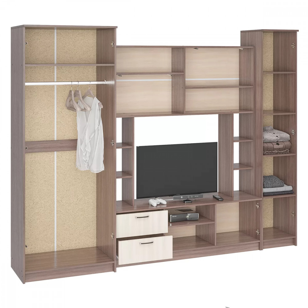 - Гостиная состоит из трёх модулей (шкаф платяной, шкаф бельевой, средняя секция),