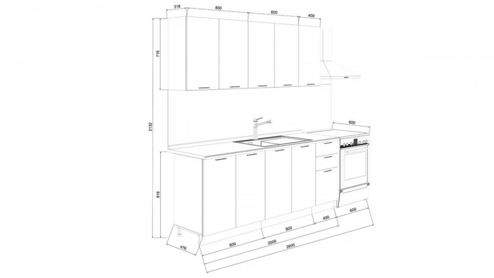 Габаритный размер готового набора модулей с учетом газовой плиты на 60 см: 2 600