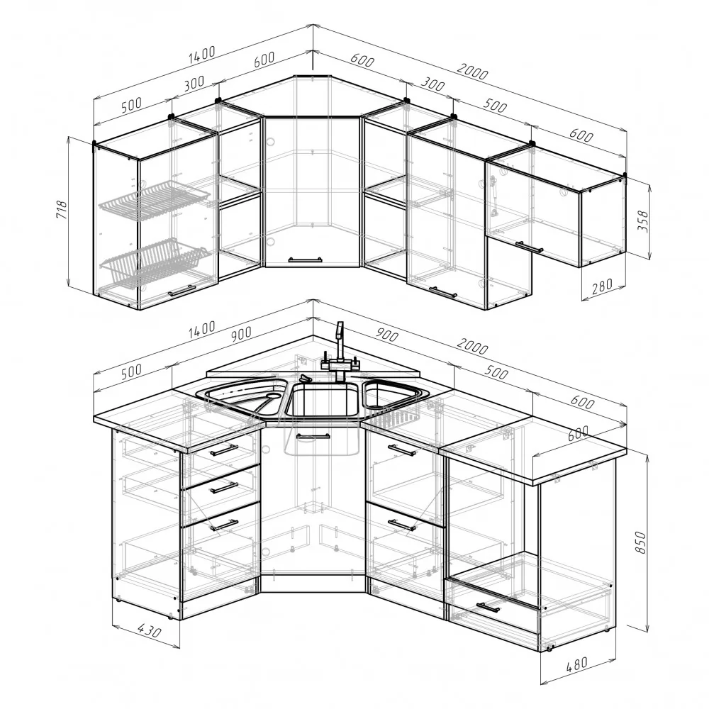 Мойки, смесители и посудосушители в комплекты гарнитуров не входят.