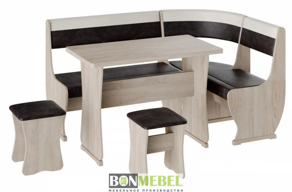Под сиденьем в скамье предусмотрен ящик. Обивка на табуретах и скамье выполнена из искусственной кожи с наполнителем из поролона. Каркас изделий изготовлен из ЛДСП, на ножках установлены пластиковые накладки.