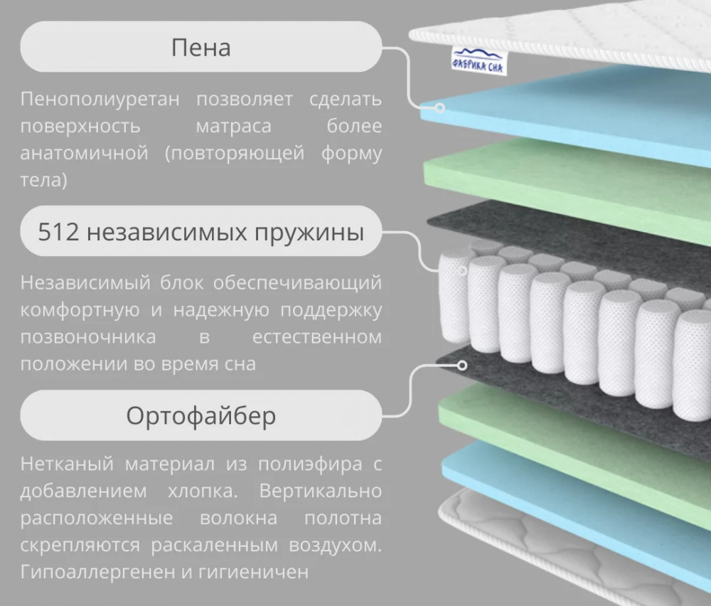 Состав: Пенополиуретан - 2 см/Ортофайбер 3 см/Термовойлок/Блок независимых пружин/Термовойлок/Ортофайбер 3 см/ Пенополиуретан - 2 см