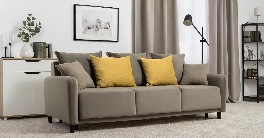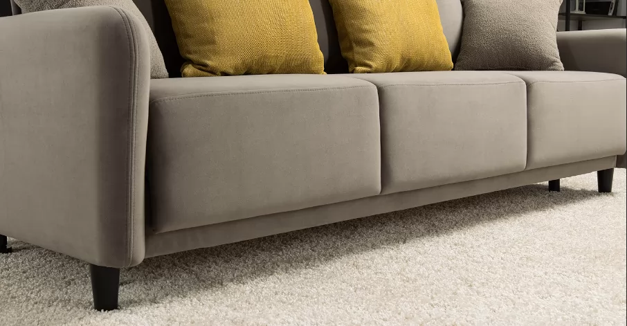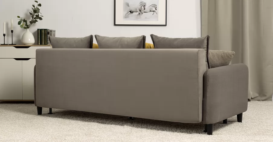 Объемные подушки обеспечивают комфортный отдых. В комплекте 5 двусторонних приспинных подушек и 2 декоративные подушки-думки в ткани букле. Надежный механизм трансформации и ровное спальное место обеспечивают полноценный сон.