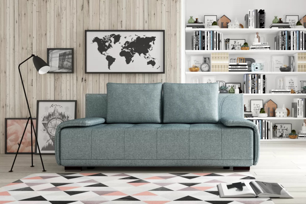 Оригинальный подлокотник с механизмом трансформации уменьшают габариты дивана в сложенном ввиде и организуют рабочцю поверхность в сложенном ввиде.