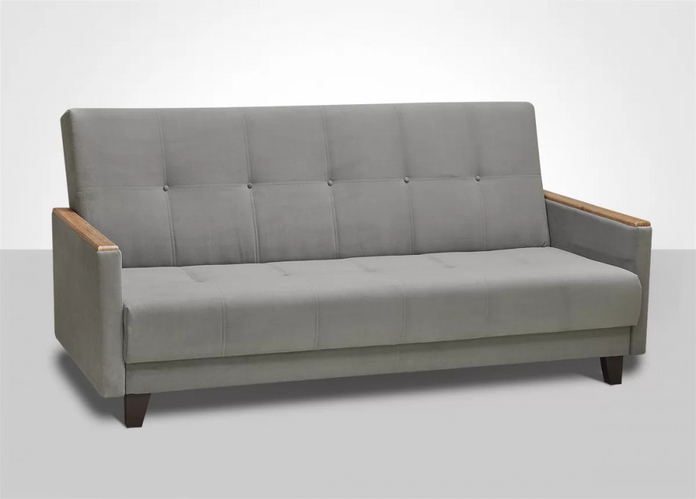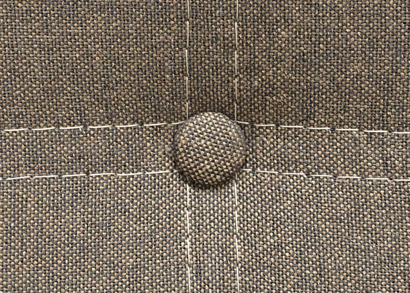 Минималистичный дизайн с прямоугольными  узкими подлокотниками, практичная накладка из ламинированного МДФ под дерево, 10 утяжек пуговиц, контрастная отстрочка.