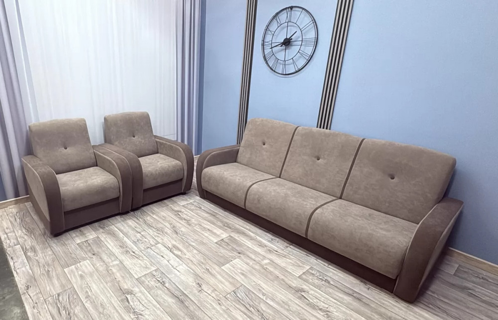 Это лучший вариант соотношения «цена-качество». Спальное место дивана основано на пружинных блоках, соединенных между собой механизмом раскладки «Книжка». Имеется вместительный короб для бельевых принадлежностей. Съемные подлокотники упрощают процесс транспортировки. Два уютных кресла прекрасно дополнят обстановку любого интерьера.