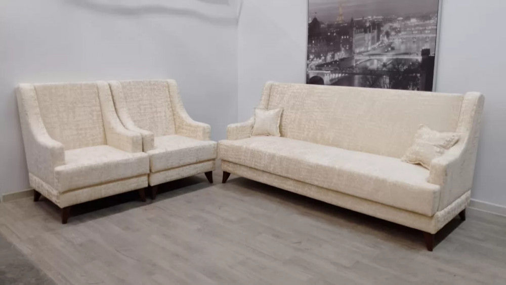 Описание дивана: Каркас - древесина хвойных пород Способ раскладки - "Книжка" Бельевой короб - ЛДСП Спинка, сиденье- независимый пружинный блок 120 мм, ППУ высокой плотности 30 мм Обивка - под заказ Опоры - пластиковые изделия Габариты- 2100*980*800 Спальное место - 1900*1200 Размеры кресла: 750*850*1020 Объем - 2,8 м3
