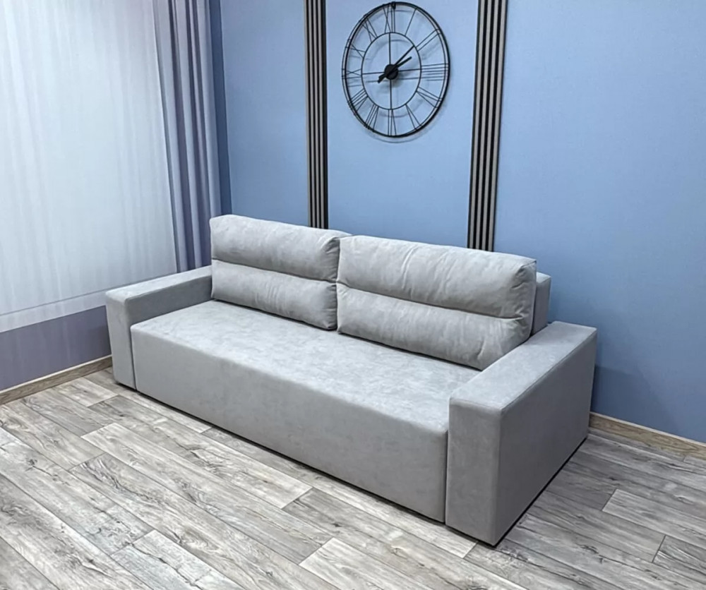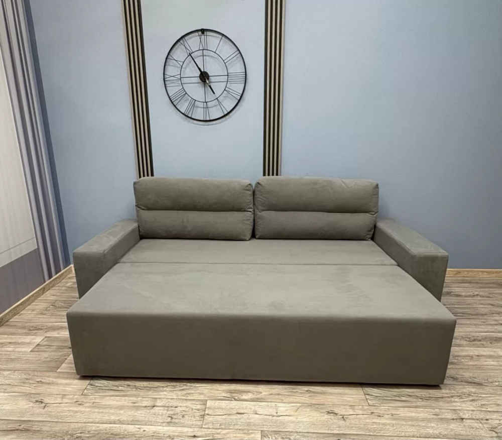 Каркас - древесина хвойных пород Способ раскладки –«Евро-книжка» Подушки - гипоаллергенный "Микс" Спинка, сиденье - независимый пружинный блок 120 мм, ППУ высокой плотности 30 мм Бельевой короб - ЛДСП Обивка - под заказ Опоры - пластиковые элементы Габариты - 2220*1000*900мм Спальное место - 2000*1600мм