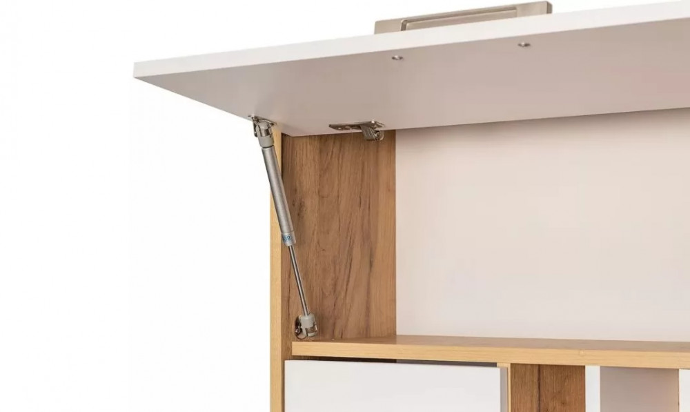 Рабочий стол отлично подойдет для комнаты школьника или организации домашнего офиса. Современный дизайн конструкции прекрасно впишется в интерьер любой комнаты. На широкой столешнице можно свободно разместить ноутбук, настольную лампу и письменные принадлежности. Богатая система хранения позволит содержать рабочее место в чистоте и порядке. Конструкция состоит из закрытого вертикального блока с тремя полками, выдвижного ящика и двух объемных ниш с откидными дверцами. Дополнительно в систему включена большая открытая полка с отсеками для документов.
