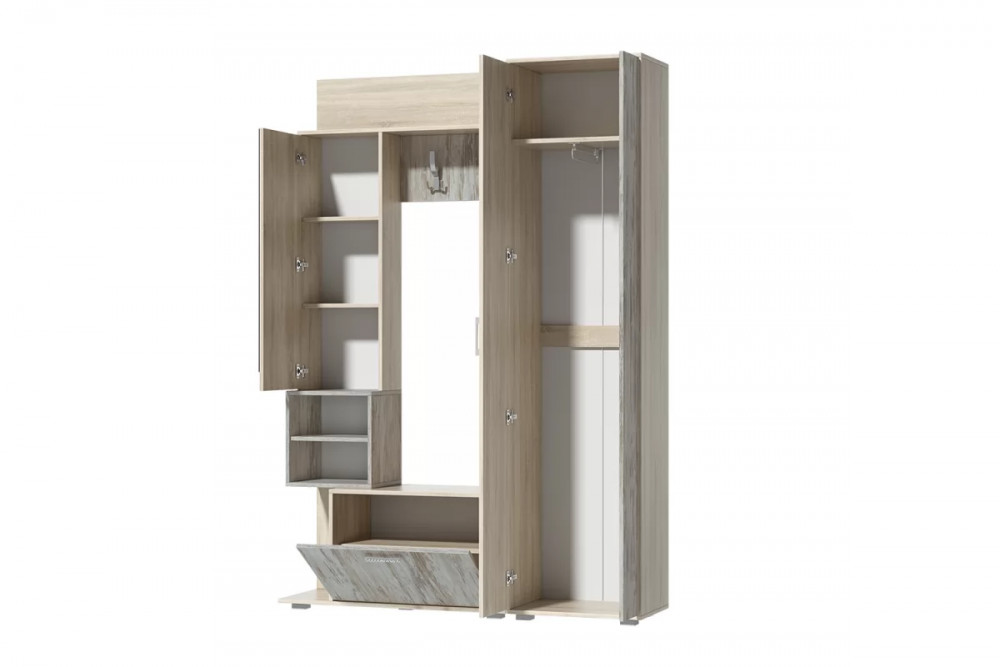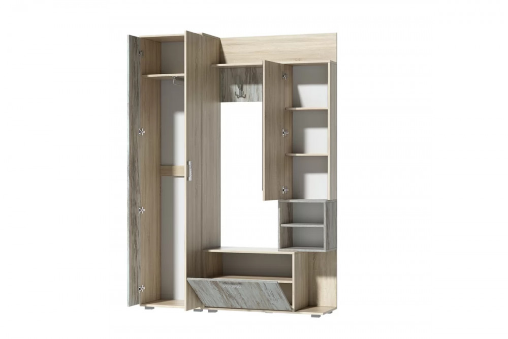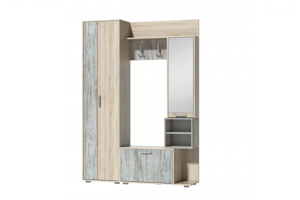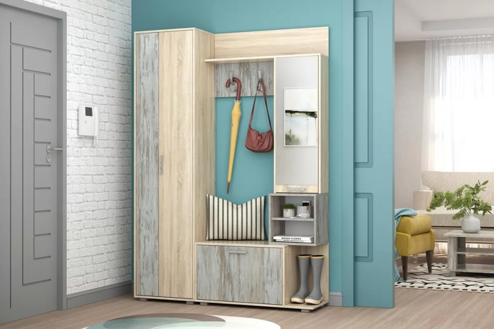 Компактная прихожая "Грейс" представляет собой функциональный модуль для установки во входной зоне студии, в прихожей квартиры или дома, в помещении офиса. В состав изделия входит всё необходимое для удобного хранения одежды, домашней и уличной обуви, головных уборов и сумок.Модуль оснащен секцией с выдвижной штангой для вешалок, открытыми и закрытыми полками, крючками для аксессуаров, тумбой под обувь. Фасад сеции с полками декорирован высоким зеркалом.