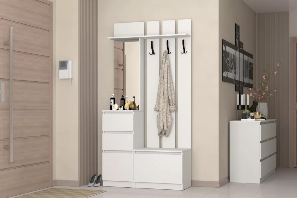 Прихожая входит в модульную систему с разнообразным набором модулей: шкафы и кровати разных размеров, письменные столы, комоды, тумбы под ТВ. Благодаря этому можно оформить интерьер всей квартиры в одном стиле.