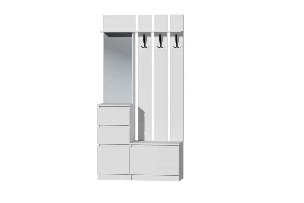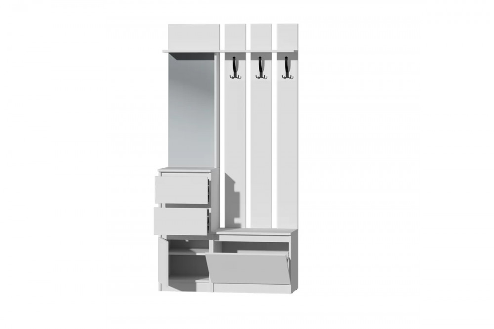 У данной прихожей 2 выдвижных ящика, 1 распашная и 1 откидная створка, отдел с крючками для верхней одежды.