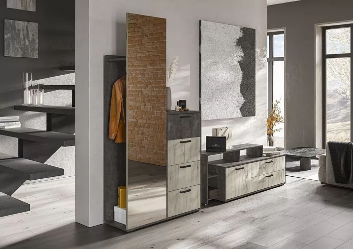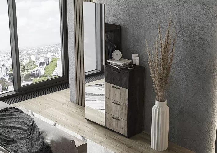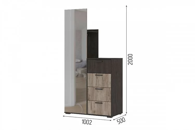 Высота, мм-2000Ширина, мм-1002Глубина, мм-500Вес, кг-52Расположение-Левое, по зеркалуМатериал корпуса-ЛДСПМатериал фасада-ЛДСП, зеркалоЦвет корпуса-Железный каменьЦвет фасада-Дуб крафт серыйКоличество зеркал-1Количество ящиков-4