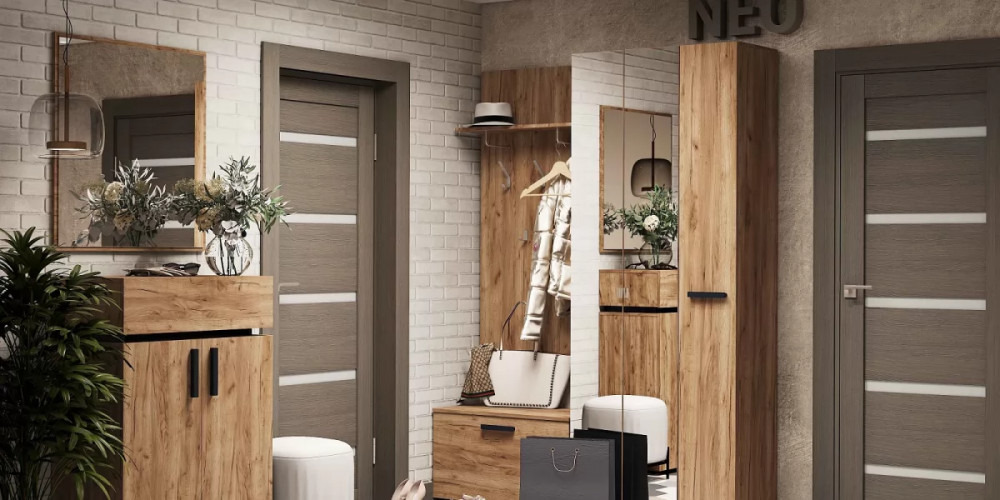 Благодаря небольшим размерам все модули коллекции NEO подойдут для организации хранения вещей даже в маленькой прихожей. Дизайн модулей отличается строгими линиями и геометричными формами, подчеркнутыми темными трапециевидными ручками. Ни одна прихожая не обходится без вешалки. Лаконичная настенная панель с полкой для головных уборов и крючками выполняет роль открытого шкафа, не занимающего много пространства в прихожей. Функциональной деталью интерьера в стиле лофт станет тумба. Простая конструкция не занимает много полезной площади и благодаря специальному отсеку организовывает удобное хранение разных вещей.