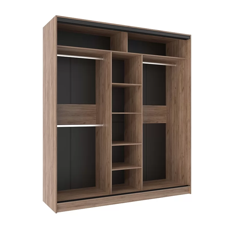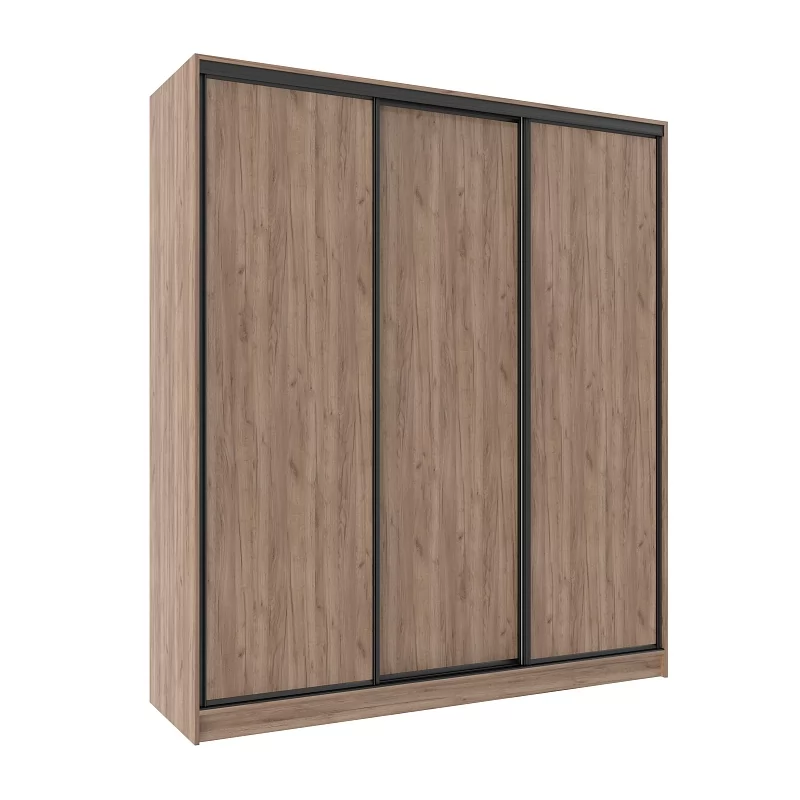 В шкафу-купе шириной 2 м найдется место для гардероба всей семьи. Разместите в нем бельё, верхнюю одежду, головные уборы и саквояж. Продуманное внутреннее наполнение, состоящее из трёх стационарных штанг и полок для белья, позволяет зонировать хранение одежды каждого члена семьи. Благодаря разделению фасада на три двери, доставать вещи очень легко. В комплектацию входит шлегель - щётки с толстым ворсом, которые устанавливаются на профиль дверей шкафа-купе и приглушают удары дверей при закрывании, а также способствуют пыленепроницаемости. На скрытых полкодержателях Titus полки шкафов-купе крепятся жестко. Возможна регулировка полок по высоте. В шкафу-купе используется стальная система "Найди". Применяемый в ее изготовлении металл обеспечивает мебели необходимую прочность и долговечность. По краю дверей шкафа-купе защитная пленка препятствует повреждению красочного слоя металлического профиля. После установки шкафа ее можно удалить.