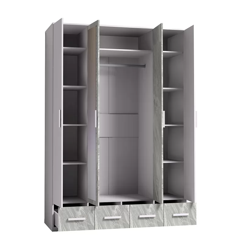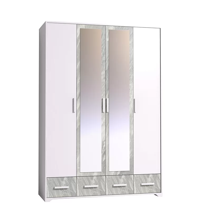 Четырехдверный шкаф для одежды и белья Айрис 555 с зеркалами и выдвижными ящиками - настоящая находка для большой и маленькой квартиры. Шкаф оснащен отделениями для хранения белья с полками на скрытых полкодержателях и отделением для одежды со стационарной штангой длиной 749 мм. Штанга выдерживает нагрузку до 40 кг. 4 выдвижных ящика комплектуются шариковыми направляющими. Такой шкаф с ящиками сможет заменить полноценный комод в маленькой спальне. Петли с доводчиками для бесшумного закрывания дверок шкафа.