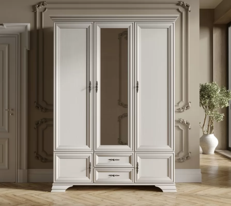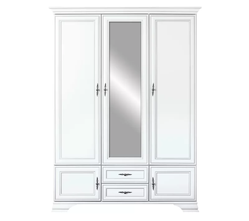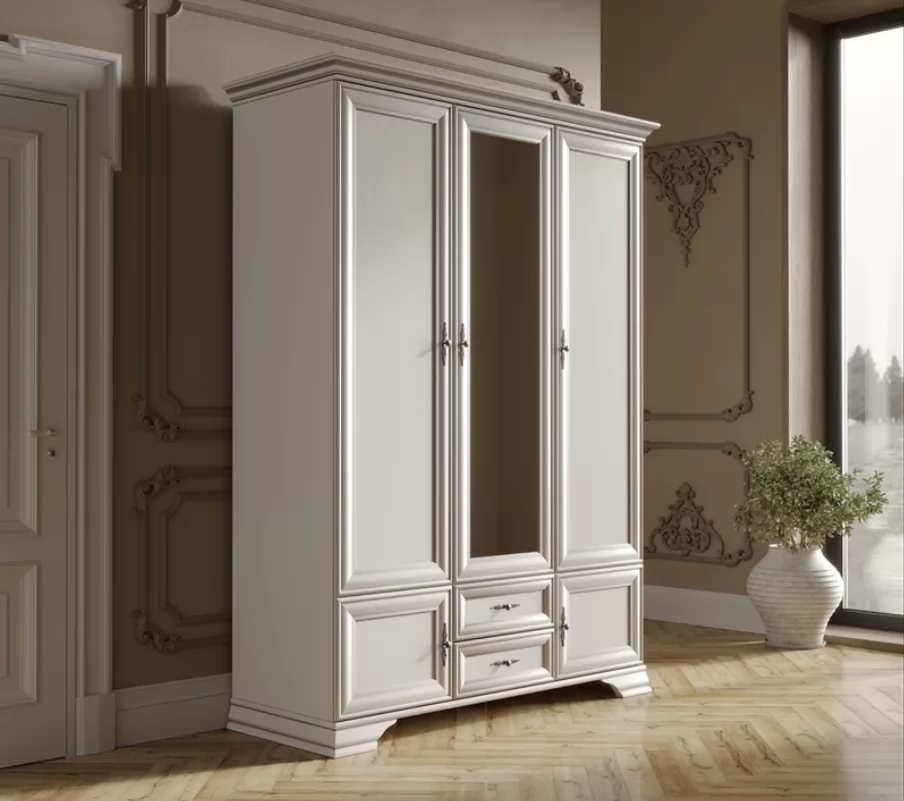 Центральная дверца шкафа имеет зеркальную поверхность, которая визуально увеличивает пространство комнаты и удобство в повседневном использовании. Витиеватые ручки гармонично сочетаются со светлым цветом фасада. Изделие стоит на прочных резных ножках, что гарантирует устойчивое расположение на полу.