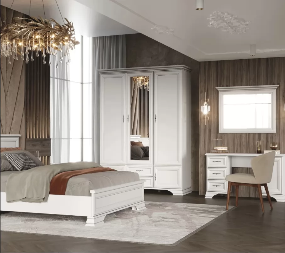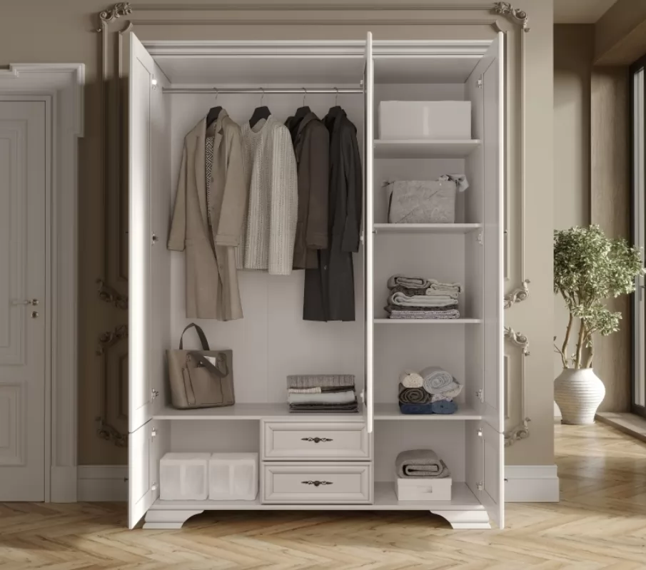 Правое отделение шкафа состоит из просторных полок, которые предоставляют место для хранения одежды в стопках, постельного белья или аксессуаров. Левое отделение включает в себя штангу для вешалок, что позволяет удобно разместить вещи любого типа и сезона. В нижней части шифоньера расположены два выдвижных ящика, обеспечивающих дополнительное пространство для расположения более мелких предметов, белья или обуви.