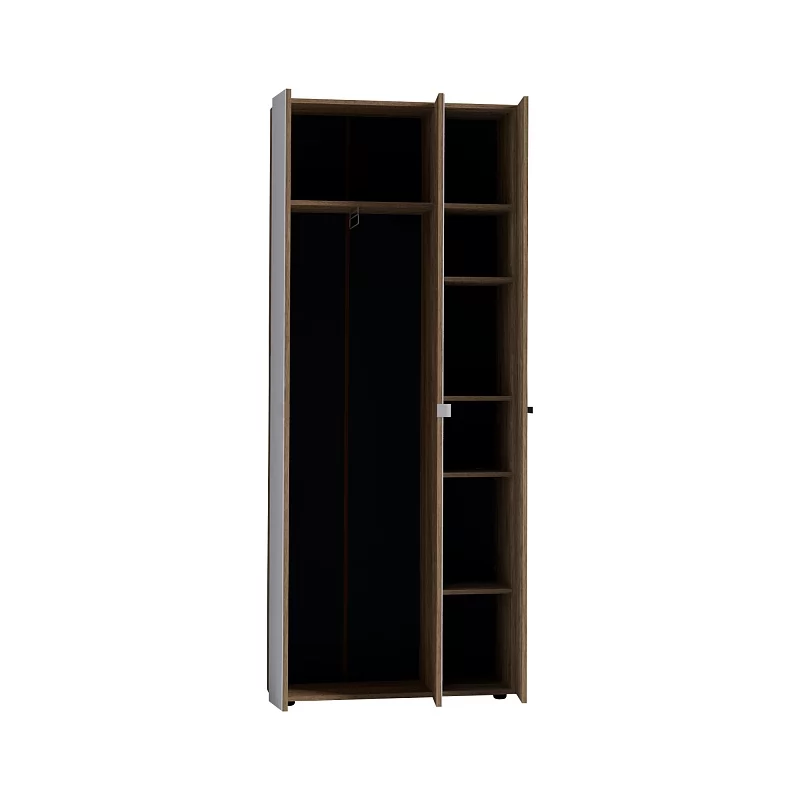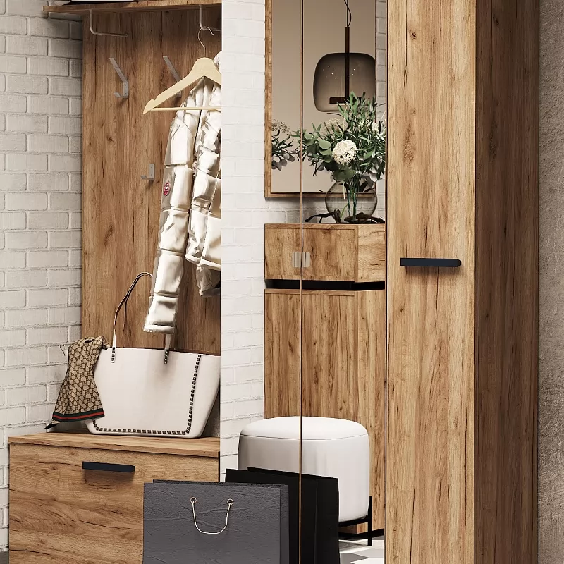 Компактный трехстворчатый NEO 87 Шкаф для одежды будет уместен в прихожей любых размеров. Глухой фасад в актуальном декоре Дуб Табачный с ручкой из массива дерева. Один из зеркальных фасадов с металлической ручкой, чтобы открывать шкаф и при этом не оставлять следов на зеркале. В этом шкафу есть все необходимое для размещения верхней одежды: выдвижная штанга, верхняя полка, ряд регулируемых полок.
