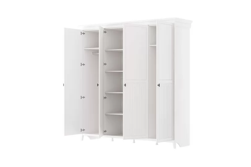 Глубина - 589 мм Ширина - 2160 мм Высота - 2200 мм Срок службы - 7 лет Гарантийный срок - 18 месяцев Монтаж - Требует сборки Модульность изделия - Да Фрезеровка фасада - Да Материал фасада - МДФ Материал корпуса - ЛДСП Материал полок - ЛДСП Материал опоры - Массив Вариант отделки фасада - Лакокрасочное покрытие Количество дверей - 4 шт Фурнитура - Штанга для одежды, Шариковые направляющие полного выдвижения, Петли с доводчиком Цвет корпуса - Белый Цвет фасада - Лак белый