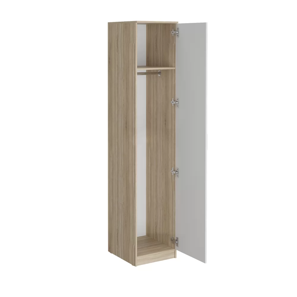 Универсальный пенал с полками и штангой - можно установить все полки и использовать для хозяйственных вещей,можно совместить - и удалив несколько верхних полок, применить штангу для вешалок с короткими вещами или же сделать полностью гардеробный пенал для длинных вещей на плечиках - уставив только верхнюю и нижнюю полку.