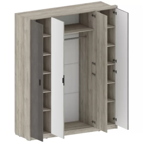 Фасады шкафов декорированы зеркалами с обработкой фацет. Высота шкафов составляет 2330 мм, а полезная глубина 568 мм. Шкафы изготовлены из материала ЛДСП 16 мм, задняя стенка из ХДФ. Фасады представлены как в однотонном так и в комбинированном варианте: створки из МДФ 16 мм под пленкой ПВХ.
