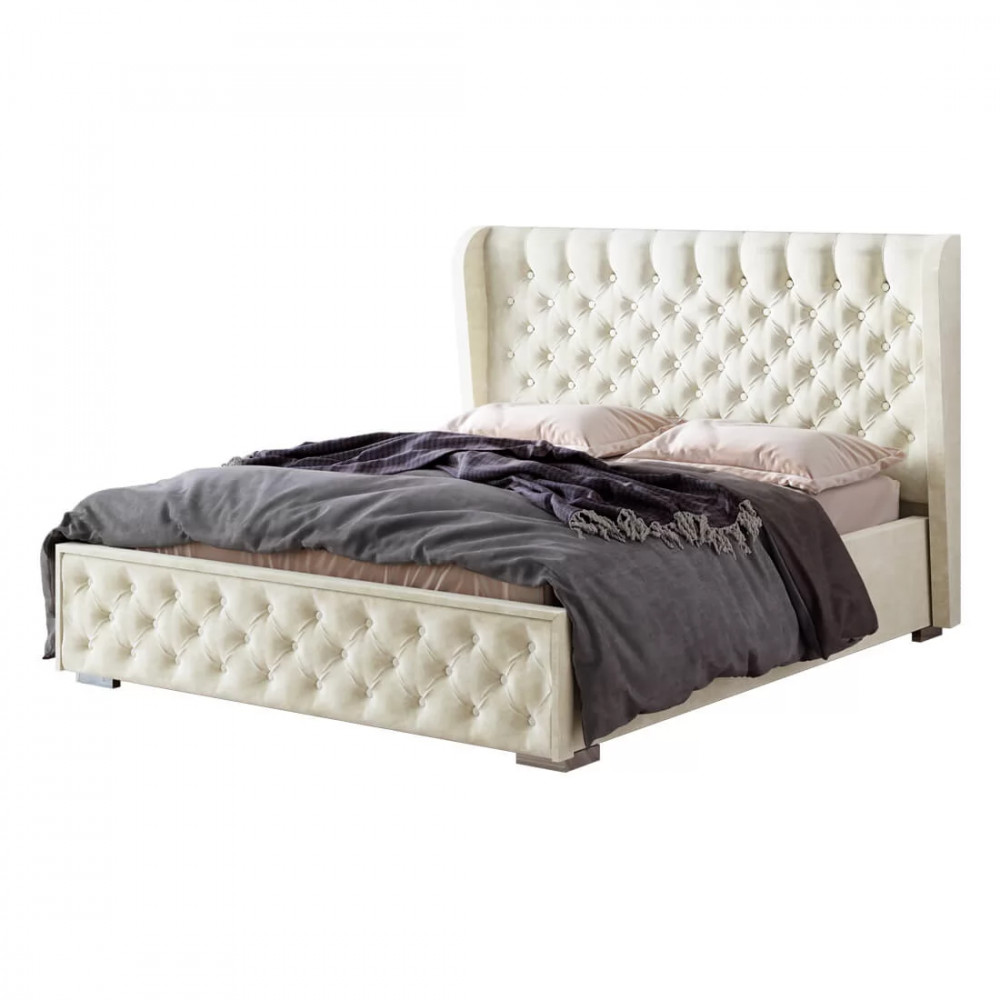 -корпус изделия выполнен из ЛДСП высокого качества, -в дизайне модели используется велюр приятного цвета графит, -высокое мягкое изголовье имеет декоративную стяжку с пуговицами, такой прием придает кровати элегантности.
