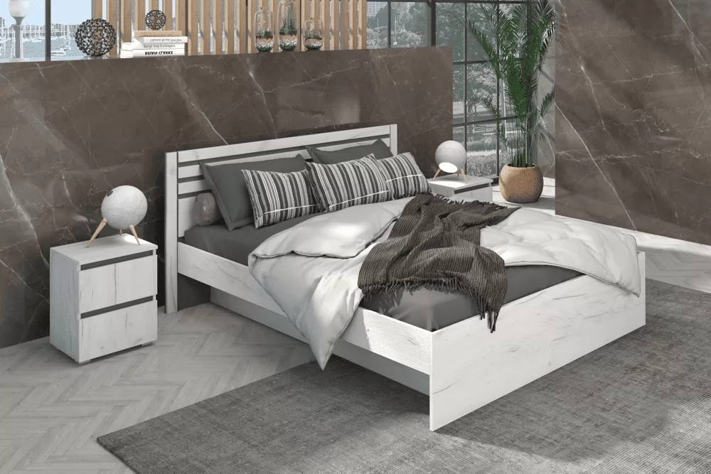 Изящная и функциональная спальня "Лиана" выполнена в модном цвете ЛДСП крафт белый с контрастными вставками цвета графит, либо крафт золотой. Кровать "Лиана" с настилом из ЛДСП рассчитана на нагрузку до 90кг на 1 спальное место. Матрас в комплектацию кровати не входит и приобретается отдельно
