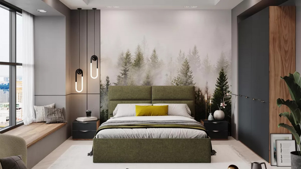 Спальный гарнитур «Глосс» №10 Яблоня Беллуно, Стекло Графит матовый, Микровелюр Jercy Deep Green в Муравленко